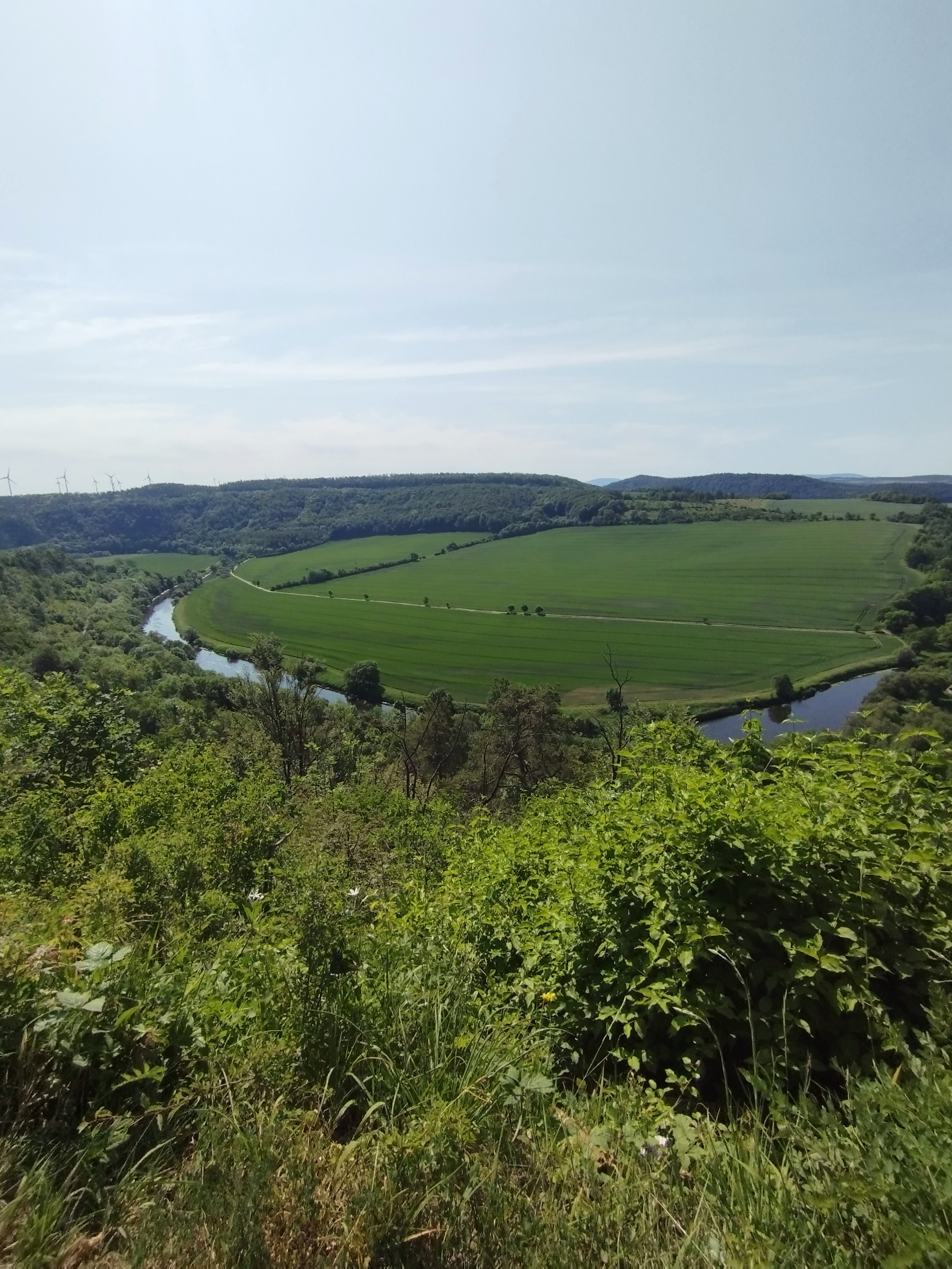 (3) Naturschutzgebiet Ebenauer Köpfe und Wisch: Auf geschotterten Wegen geht es stetig bergauf. Angekommen an einer kleinen Schutzhütte mit Rastplätzen, werden wir mit einem weitläufigen Ausblick auf das Werratal belohnt. Um uns herum liegen blühende Kalkmagerrasenflächen mit zahlreichen Wacholderbüsche, Orchideen und Wildkräutern.