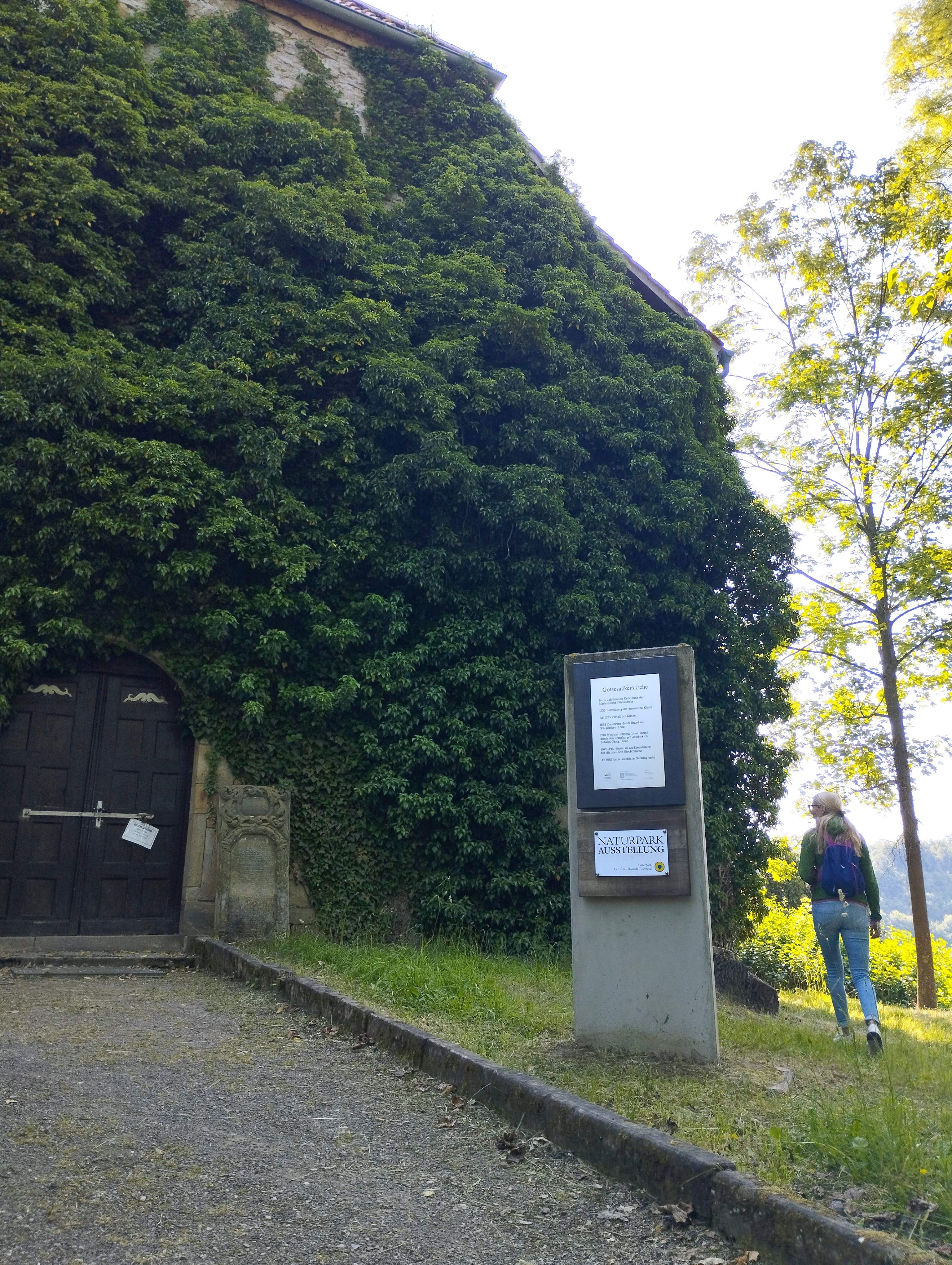 (2) Hinauf zur Gottesackerkirche: Wir laufen unter einen prachtvoll verzierten Torbogen hindurch und erklimmen einige Steinstufen, bis wir zur Gottesackerkirche gelangen. Das Mauerwerk der Kirche ist fast nicht zu erkennen, da sie nahezu komplett in Efeu eingekleidet ist. Heutzutage erfährt sie keine kirchliche Nutzung, sondern beherbergt eine Ausstellung des Naturparks Eichsfeld-Hainich-Werratal.