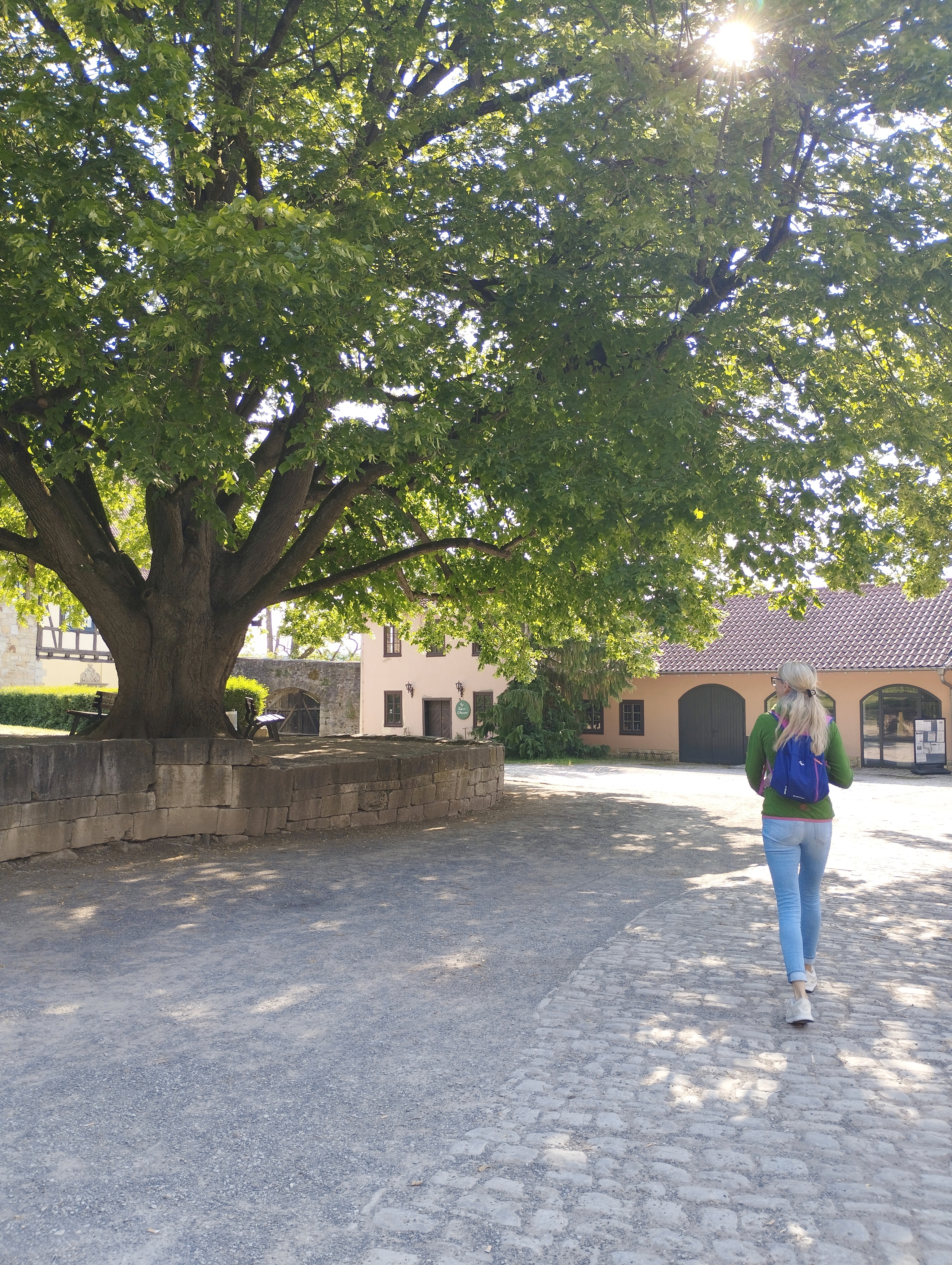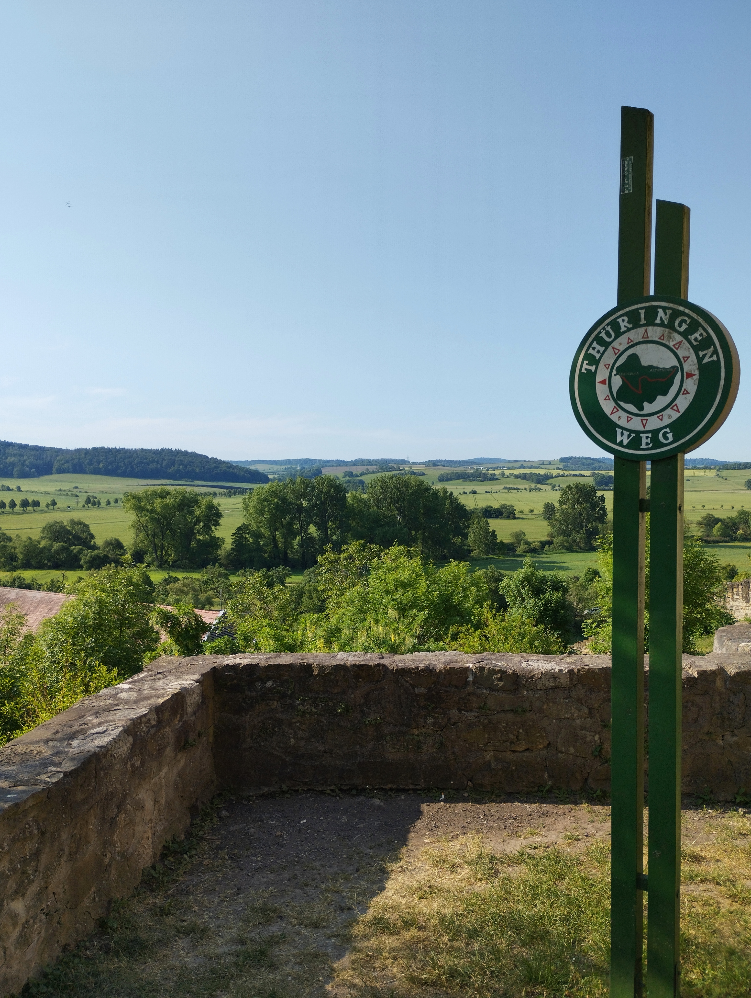 (1) Die Creuzburg selbst: Nach einem kurzen Anstieg erreichen wir die Burgmauern der Creuzburg. Hier eröffnet sich zu unserer Linken der erste großartige Ausblick auf umliegende Wiesen, Felder und Wälder. Hinter den Burgmauern lädt das Mittags-/Kaffee- oder Abendbrotangebot zum Verweilen ein.